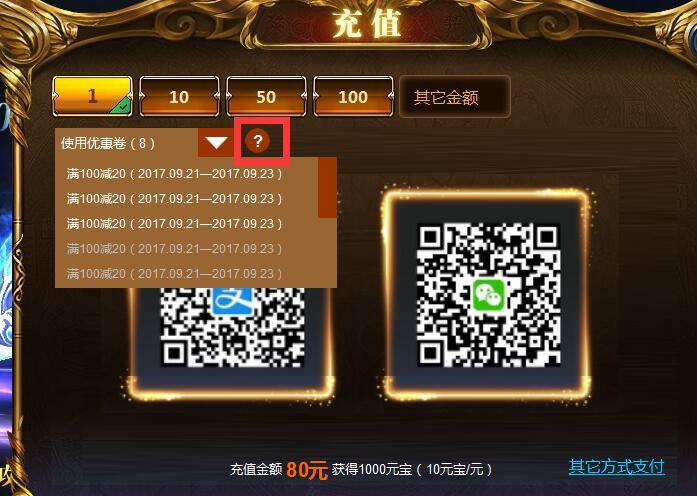 在规定游戏中进行充值,在支付页面中勾选优惠券并充值满足指定金额即可满减(如下图)